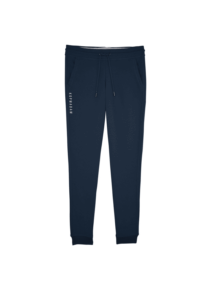 Kopmadam, voor alle dames, ladies en chickas van het steeds groeiende vrouwenpeloton. Samen met Elke Bleyaert ontwikkelde we deze nieuwe damescollectie. Elke is de vrouw achter toprenner Jasper Stuyven maar heeft zelf ook een hoop pluimen op haar hoed. Zo is ze onder meer oprichtster van Les Femmes Flahutes, een dames peloton met renster uit alle hoeken van het land. Daarnaast is ze ook the founder van The Women Peloton, gestart in April met een podcast maar nu al uitgegroeid tot een online platform waar (women-based)content op te vinden is voor vrouwen op de fiets. Elke zal er mee voor zorgen dat er nog meer aandacht naar echte ladies prints gaat maar zal ook zorgen voor extra aandacht voor de “snits en fits” van onze dameskleding. Deze medium fit joggingbroek met subtiele print op het rechterbeen in navy kleur en ultrazachte stof zijn één van haar bijdrages!